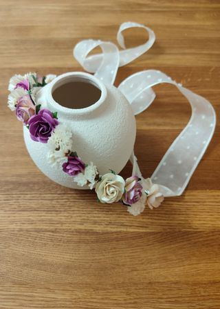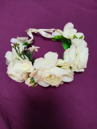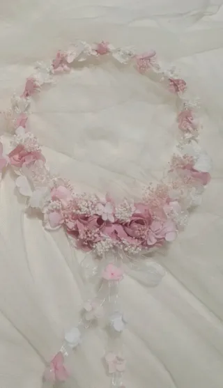 Corona de flores ideal para comuniones o eventos especiales. - Adornada con flores de tela en tonos rosas y blancas. - Detalles de hojas verdes y elementos secos. - Diseño delicado y artesanal.
