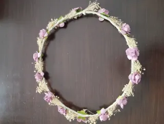 Corona de flores secas, ideal para comuniones o eventos especiales. Elaborada con delicadas flores en tonos rosados y púrpuras. - Flores secas variadas. - Diseño circular. - Hecha a mano se hacen por encargo