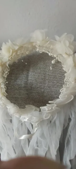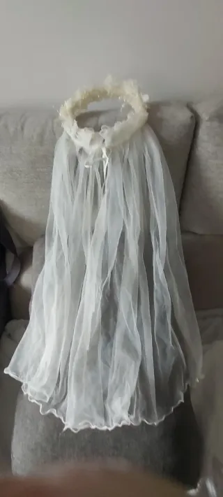 Precioso velo de comunión con corona, un accesorio vintage. - Corona adornada con detalles florales y perlas. - Velo de tul fino y ligero. - Cierre con lazos. De color perla. Esta muy bien...ha estado guardado.por muchos años ya que se uso 1 vez hace más de 50 años...