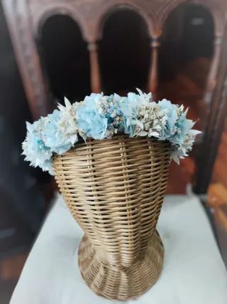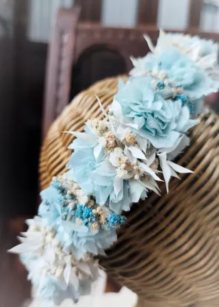 Corona de flores preservadas, ideal para adornar. - Flores en tonos azules y blancos. - Diseño delicado y natural. ✨👑 Corona vintage de flores preservadas en tonos azules y beige 👑✨ Una pieza delicada, romántica y muy elegante 💙🤍 elaborada con flores preservadas que mantienen su belleza con el paso del tiempo. Perfecta para ceremonias de arras 👧, comuniones ⛪, bodas 💍 o cualquier evento especial donde quieras lucir un complemento fino, actual y lleno de encanto. 🌸 Su combinación de tonos azules y beige aporta un estilo dulce, natural y atemporal que realza cualquier look. ✨🌿 #coronavintage #florespreservadas #tocadosel
