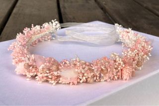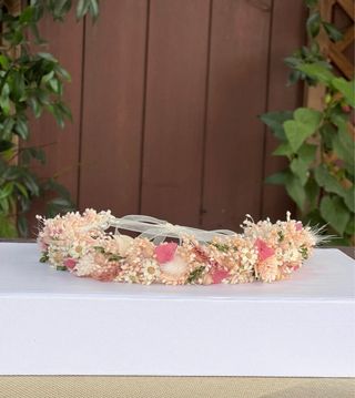 Preciosa corona de flores ideal para una comunión. Está hecha con flores secas en tonos rosas y verdes azulados. - Flores delicadas y suaves. - Diseño circular, perfecto para lucir en un día especial. - Ideal como tocado para niñas.