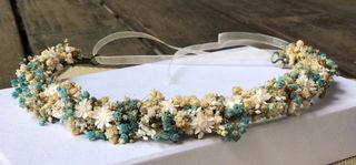 Corona para comunión o novia. Hecha a mano. De flores secas y preservadas. Eucalipto, hortensias,paniculata, cola de conejo... con terminación de lazo de organza.