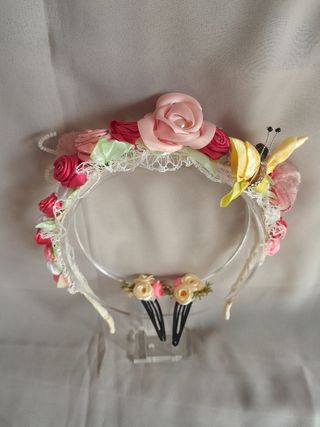 Diadema o corona de flores para comunión o fiesta con 2 horquillas a juego, confeccionada enteramente a mano de tela raso, encaje y abalorios. También se regala la mariposa en la pequeña pinza que se puede utilizar junto o por separado. Piezas únicas. No es negociable, el precio está muy por debajo de trabajo de mano.