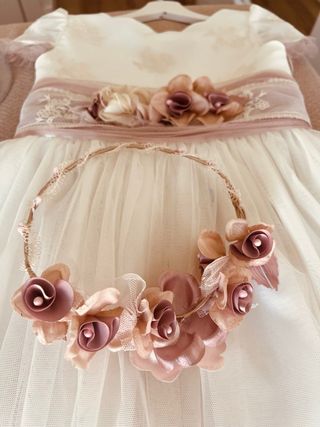 Precioso tocado para niña, ideal para una comunión. Incluye una delicada corona de flores en tonos rosas y blancos y los adornos de los zapatos a juego.