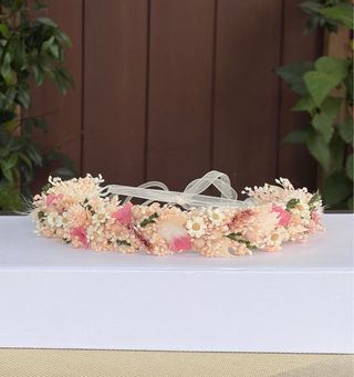 Preciosa corona de flores para niña, ideal para una comunión. Es delicada y encantadora. - Perfecta para un evento especial. - Elaborada con flores secas. - Incluye una cinta para atarla.
