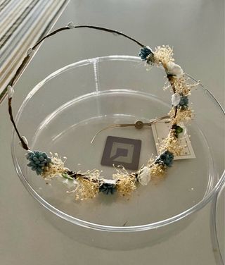 Preciosa corona para comunión, marca Coconut de El Corte Inglés. Ideal para un evento especial. Flores delicadas en tonos grises, verdes y blancos. Diseño elegante y sofisticado. Prácticamente nueva, usada sólo las horas de la Comunión. Con caja original.