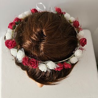 Preciosa corona para niña, ideal para una primera comunión. Es delicada y luce preciosa puesta. - Perfecta para un evento especial. - Elaborada con flores rojas y blancas. - Diseño elegante y romántico.