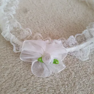 Preciosa corona adornada con encaje y lazos. - Diseño delicado con flores. - Cintas decorativas de color blanco. - Diámetro: 19 cm. Ideal para carnavales, disfraces, bodas, comuniones, despedidas de soltera, eventos y fiestas. Como nuevo. Envío activo. Opción de recogida en Hortaleza Madrid capital zona norte.