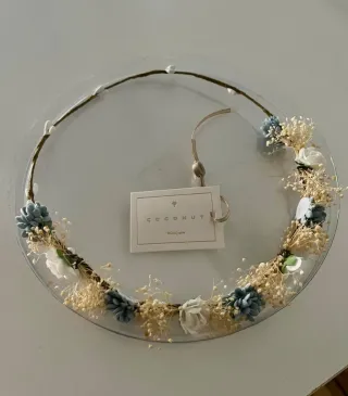Corona de flores de la marca COCONUT del Corte Ingles, ideal para comuniones o eventos especiales. Combina delicadas flores en tonos azules y blancos con detalles de espigas secas. - Diseño floral artesanal. - Base flexible y cómoda. - Adornada con pequeñas flores y espigas. - Solo usaba durante la misa de la comunión. Con caja original