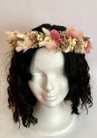 Corona de flores preservadas, ideal para comuniones o eventos especiales. Un accesorio delicado y natural. - Flores secas en tonos beige y rosa. - Diseño artesanal.