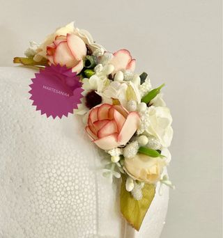 Tocado de comunión o ceremonia, colores rosas, blanco y beige. Flor artificial y ramitos naturales preservados. Se puede poner como media corona delante o detrás. Está hecha con alambre y se puede moldear.