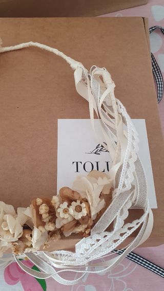 Preciosa corona de flor saca/preservada para niña de primera comunión. Colores blanco roto , beige y las lazadas a juego en encaje y raso. Es de Tolula y esta hecha a mano.