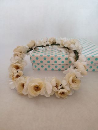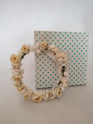 Corona de flores decorativa en tono beige. Ideal para complementar un atuendo especial para Comunión, Boda, Arras o 15 años - Adornada con pequeñas flores y detalles de encaje. - Incluye cintas largas de satén. - Incluye caja. - De tamaño ajustable mediante velcro. - Nuevo a estrenar. Envíos en el mismo día! Más artículos de Comunión y Ceremonia en mi perfil. Consulta sin compromiso :) Si te lo llevas junto a otros artículos al mismo tiempo, te ajusto el precio. Junto a este artículo te puedes llevar: +5€ funda de traje/vestido en tela (fondo de las fotos) +5€ par de guantes elásticos talla única (elije del perfil)