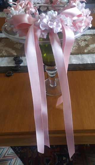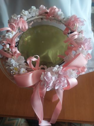 Bonita corona para niña de comunión en tonos crudos y rosas con lazo de raso.
