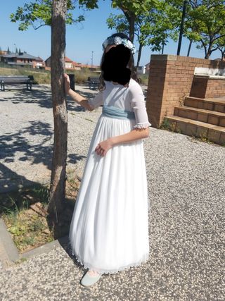 Vestido de Comunión talla 10-11 años. Color blanco roto. Con cancán incorporado. Regalo corona a juego con flores del vestido. Se pueden quitar las flores, las cosí yo. Medidas 122cm de largo y 37cm de ancho en zona cinturón.