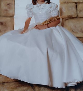 Traje de comunión de seda con cinturón y corona para una niña de 8 años. Medida de largo 1,16.