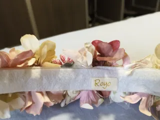 Preciosa corona de comunión de la marca Royo, con un diseño floral delicado. - Flores en tonos beige y rosa. - Detalle de lazo con el nombre de la marca.
