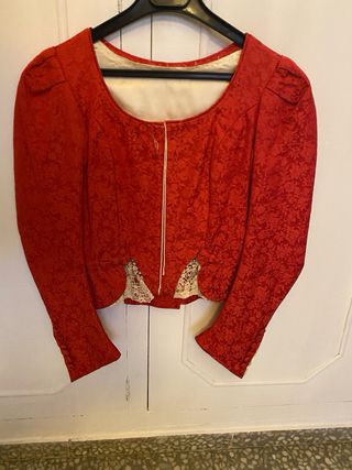 Precioso corpiño de fallera, ideal para lucir en tus próximas fiestas. Es de color rojo y blanco, con detalles de encaje. - Talle 41cm -espalda 36cm -Brazo 28cm - Confeccionado en tejido brillante. - Elegante cuello y puños de encaje blanco.