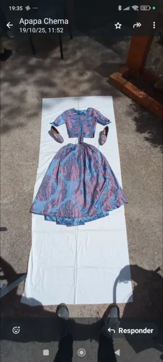 traje talla Xs/S corpiño la falda tiene pata bastante cintura yo mido 1,60 ver. Fotos no tengo las medidas ya que es por mudanza y necesito venderlo urgente manteleta de la falda tiene un mini agujero incluye zapatos talla 38 TAMBIEN SE ALQUILA SEMANA DE FALLAS 300 y 150 de dianza se devuelven a la entrega del vestido en sus consiciones que estaba