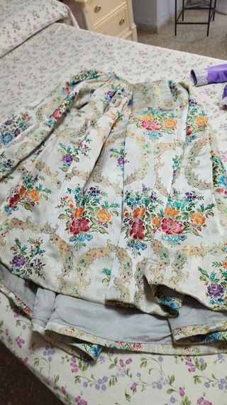 Traje de fallera con un bonito estampado floral. - Corpiño y falda. - Tejido con detalles dorados y rosas. Tiene para sacar más tela. Se puede utilizar la tela para confeccionar nuevo traje.