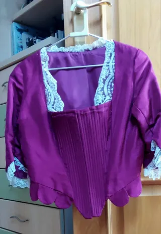 Precioso corpiño de fallera para adulta, en color morado y puntilla blanca, para combinar con metal oro o plata. Es una prenda elegante y delicada. - Diseño de corpiño manga larga. - Adorno de encaje en el cuello. - Bordado de flores en las mangas y parte trasera. - Bordado floral en la parte delantera. - Largo de manga 60 cm. - Ancho aproximadamente 47-50 cm. - Está en perfecto estado y como nuevo. Se puede venir a ver y probar, preguntar sin compromiso.