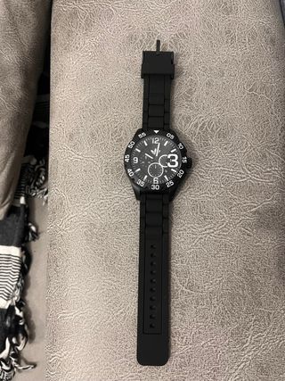 Reloj deportivo con diseño moderno. - Correa de caucho. - Esfera negra con detalles en blanco. - Bisel con marcadores de tiempo.