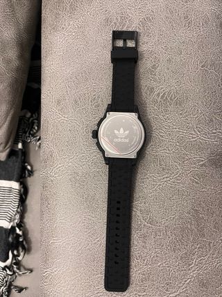 Reloj de pulsera con un diseño moderno y llamativo. - Esfera grande con el icónico logo de Adidas. - Correa negra ajustable.