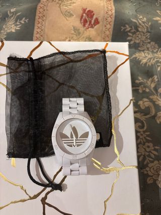 Elegante reloj con un diseño moderno y llamativo. - Esfera con el icónico logo de Adidas. - Correa de color blanco. - Detalles en tono dorado.