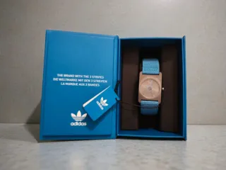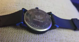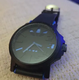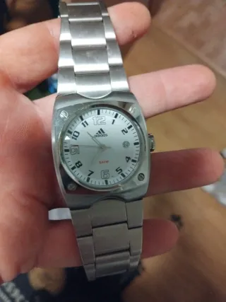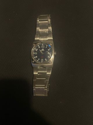Elegante reloj de pulsera con un diseño clásico. - Esfera de color azul intenso. - Correa y caja de metal dorado. Características generales • Marca: Adidas (logo visible en la esfera). • Tipo: Reloj analógico. • Esfera: • Color azul marino. • Agujas y marcadores finos en color dorado. • Diseño minimalista. • Caja: • Forma cuadrada redondeada. • Color dorado, acabado metálico. • Correa: • Tipo malla metálica / brazalete estilo “milanese” robusto. • Color dorado. • Cierre desplegable clásico. • Estado: • A simple vista, el reloj parece en buen estado, con desgaste ligero típico del uso. • No se observan grandes rayon