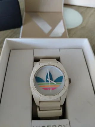Reloj de pulsera de la marca Adidas con un diseño llamativo. - Esfera blanca con el logo de Adidas en colores. - Correa de color blanco. - Bisel con números.