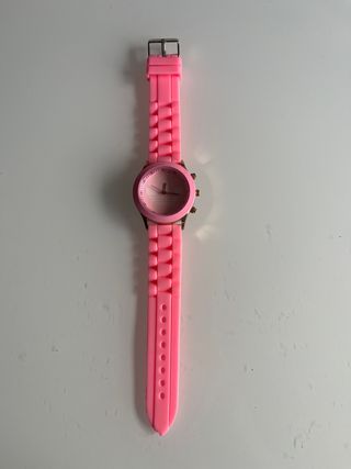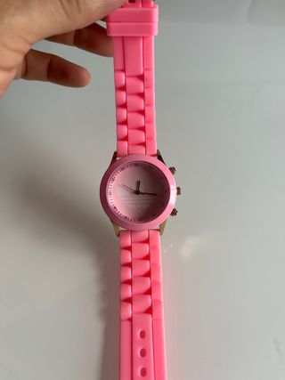 Reloj de pulsera con correa de silicona. - Correa de silicona rosa. - Detalles en tono dorado.