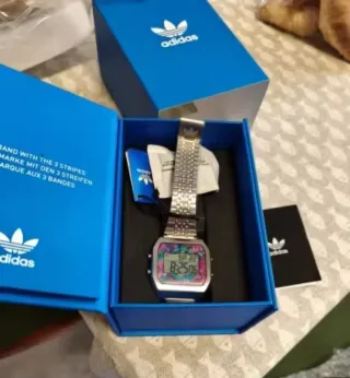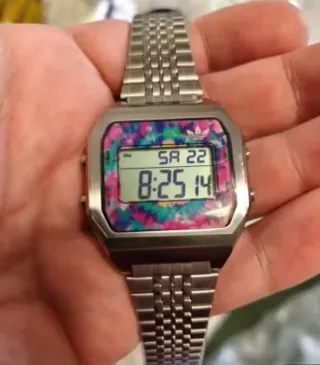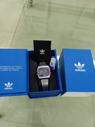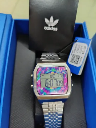 Reloj digital Adidas con un diseño llamativo y moderno. - Correa de metal plateado. - Esfera con estampado multicolor. - Cierre de seguridad. NUEVO,en su caja con etiqueta.No negociable.