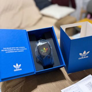Reloj Adidas con diseño Rasta y detalles multicolor. - Caja original incluida. - Correa negra. Modelo AOST24071. Nuevo con caja. diámetro: 38mm En la foto se ve en comparación con un apple watch ultra 2 de 49mm. Resistencia al agua 5 atm Modelo unisex