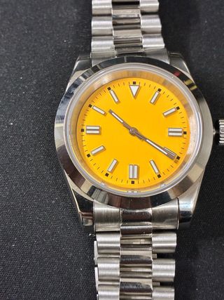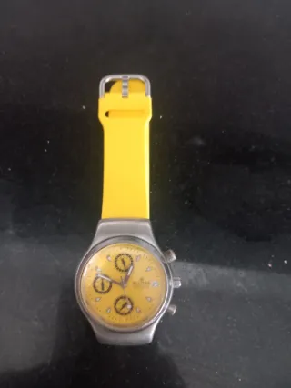 Reloj con cronógrafo de 42mm. Un accesorio deportivo y elegante. - Esfera negra con detalles amarillos. - Correa de caucho amarilla. - Bisel giratorio. Como el original.