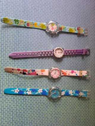 Conjunto de cuatro relojes con diseños juveniles y coloridos. 🫡 Falta poner pilas - Correa con estampado floral azul y blanco. - Correa con degradado morado. - Correa con salpicaduras de pintura multicolor. - Correa con estampado de árboles y flores amarillas.