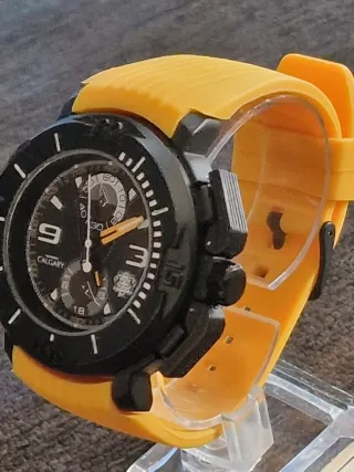 Reloj con correa de silicona amarilla y detalles en negro. - Correa con el logo CALGARY grabado. - Bisel con numeración. - Esfera con múltiples indicadores.
