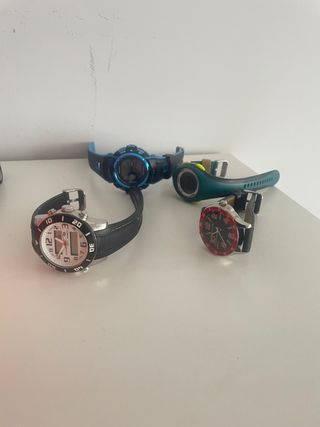 Conjunto de cuatro relojes con diferentes diseños. - Reloj digital con correa negra. - Reloj deportivo azul y negro. - Reloj con correa verde y detalles amarillos. - Reloj con esfera negra y detalles rojos. Escucho ofertas