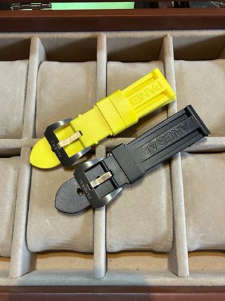 Conjunto de dos correas para relojes Panerai, una en color amarillo y otra en negro. Ambas cuentan con hebillas. - Correa de color amarillo. - Correa de color negro. - Hebillas incluidas. - Ancho 24mm