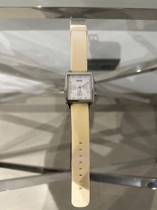 Reloj BOSS con diseño cuadrado de color plata y blancl. - Caja de acero inoxidable plateado. - Correa de material sintético. Está algo descolorida con tonos amarillos. - Esfera con detalles plateados. El PVP del reloj es de 295€