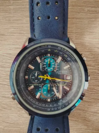 Reloj de caballero Citizen con correa azul y esfera en tonos verdes y azules. Un accesorio elegante y funcional. - Esfera con detalles en amarillo. - Correa de piel perforada. - Resistente al agua WR200.