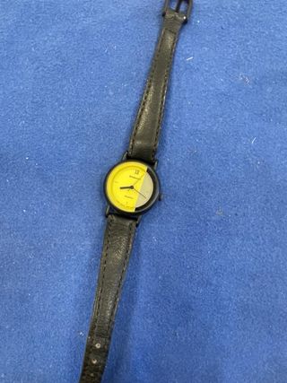 Reloj de pulsera con correa negra y esfera bicolor amarilla y gris. Esta con la pila gastada - Diseño moderno y llamativo. - Mecanismo de cuarzo. - Correa de cuero. - Cierre de hebilla.