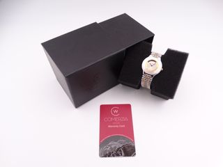 Reloj Citizen original de 1989 con diseño extraplano y acabado integral en oro amarillo. Presenta una esfera minimalista color champagne con el logotipo clásico de la marca y cristal en excelente estado tras mantenimiento. Se entrega con su brazalete de malla milanesa original y una correa adicional de piel negra. Maquinaria de cuarzo japonés de alta precisión en un formato elegante y atemporal, ideal para coleccionistas o uso formal.