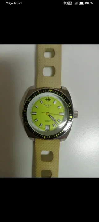 Este es un reloj de pulsera de cuarzo Zodiac Sea Dragon con una esfera verde lima vibrante y una correa de caucho a juego. Movimiento: Cuarzo suizo Ronda 715 Resistencia al agua: 100 metros Características: Caja de acero inoxidable, cristal abovedado de zafiro y bisel giratorio bidireccional
