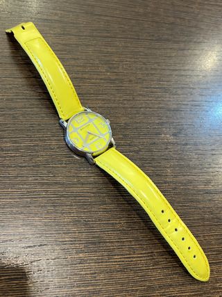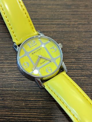 Reloj de pulsera con un diseño llamativo. - Correa de cuero sintético amarillo brillante. - Esfera redonda con detalles plateados. - Mecanismo de cuarzo.