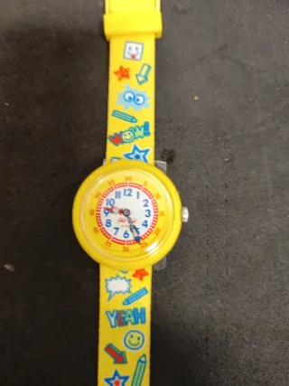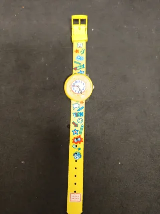 Reloj infantil con un diseño vibrante y llamativo. La esfera presenta un estampado artístico lleno de color y detalles. - Correa de silicona amarilla elástica. - Esfera redonda con diseño artístico. El diámetro de la correa mide 5,5cm.