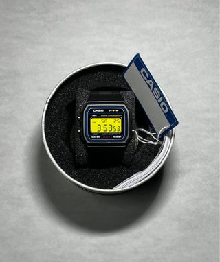 Reloj Casio F91W con pantalla modificada en color amarillo. - Diseño clásico y retro. - Correa negra. - Caja redonda.