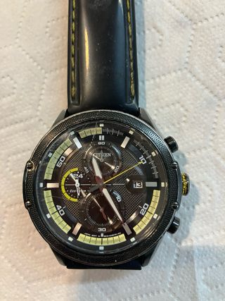 Reloj Citizen Eco-Drive con correa negra y detalles en amarillo alimentación carga infinita de luz. - Esfera con múltiples indicadores. - Cierre de hebilla.