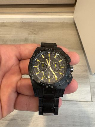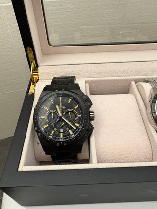 Elegante reloj Festina con un diseño deportivo y moderno. Caja y tiket. - Esfera negra con detalles amarillos. - Correa de metal negra. - Función de cronógrafo.