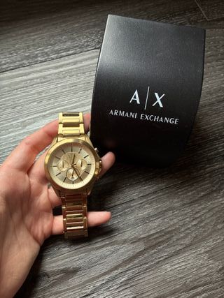 Vendo reloj original de Armani Exchange (AX) en muy buen estado. Diseño elegante con esfera negra y caja/correa dorada, estilo minimalista y moderno. Ideal para uso diario o para ocasiones especiales. Reloj de marca, ligero y cómodo. Características: Marca: Armani Exchange original Movimiento de cuarzo Esfera negra con detalles dorados Correa metálica dorada Diseño elegante y moderno 🟢 Funciona perfectamente 🟢 Muy buen estado