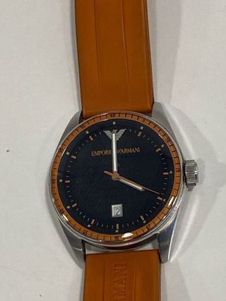 Vendo reloj Emporio Armani original ref. AR-0526. Diseño deportivo con esfera negra y detalles naranja, segundero naranja y fecha a las 6. ✅ Recién revisado en relojería ✅ Pila nueva (funcionando perfectamente) ✅ Caja de acero inoxidable ✅ Movimiento cuarzo ✅ Resistencia al agua 50 m / 5 ATM ✅ Correa negra tipo caucho/silicona con costura naranja Estado: usado, con microarañazos/marcas de uso (ver fotos, especialmente en tapa trasera/cristal).